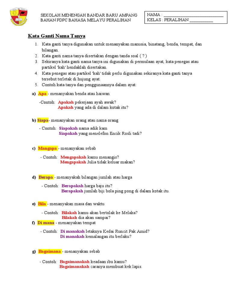 Nota Dan Latihan Kelas Peralihan Kata Ganti Nama Tanya Pdf